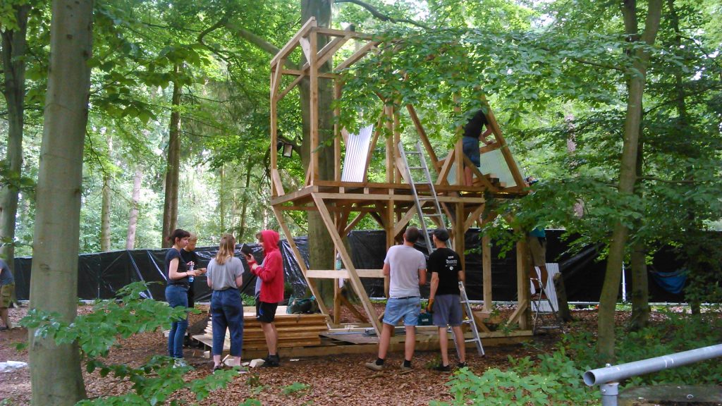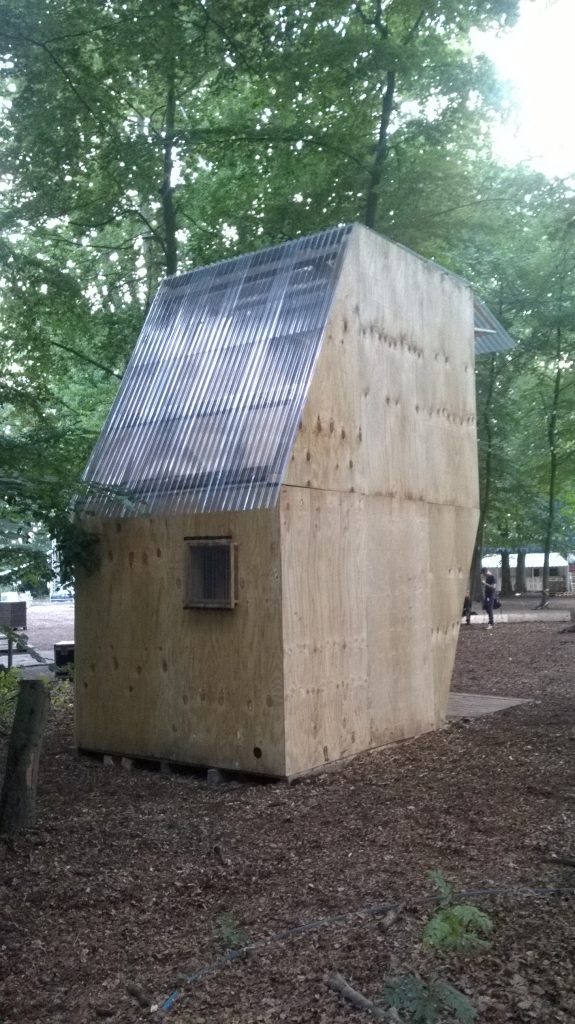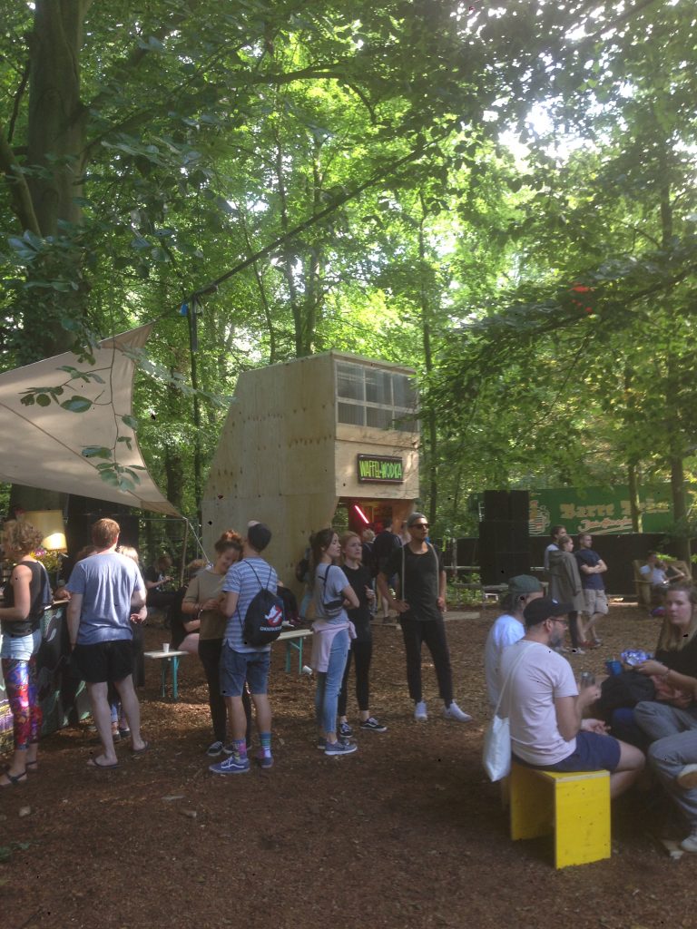 Verkaufsbude auf einem Festival mit Podium für DJ-Acts.